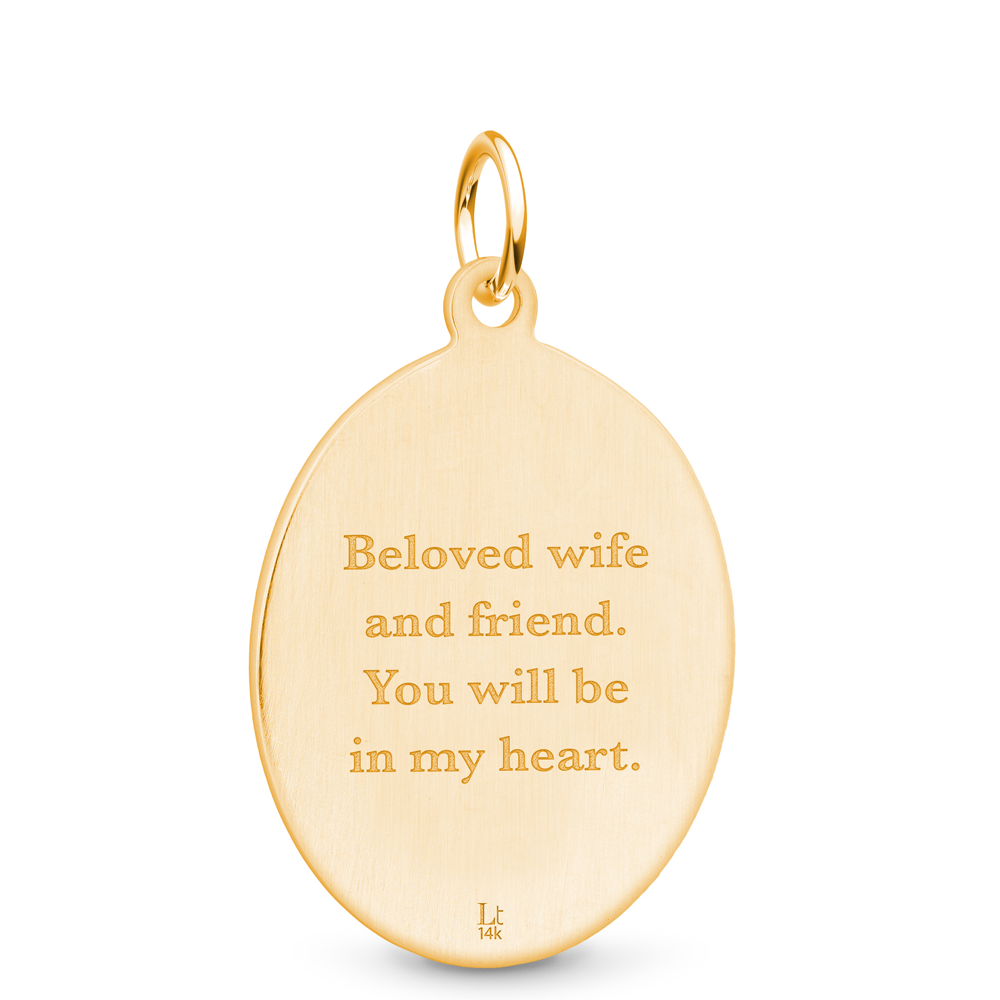Keep the touch of your Loved One close to your heart with a Fingerprint Pendant in gleaming 14-karat Yellow Gold. Beautifully balanced and finished, our Oval Pendant is finished with a raised, rounded edge, the fingerprint pattern nestled in a debossed oval to suggest the light presence of a fingertip's touch. Please note that personalized inscriptions are limited to four lines of 12 characters each, maximum. Spaces between words count as characters.